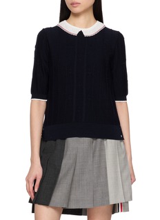 自带复古质感的短袖针织衫,美利奴羊毛泡泡纹显细腻,蕾丝领搭配撞色袖口藏巧思。标志性三色条纹呼应品牌调性,搭裙装显温柔、配裤装显干练,是 Thom Browne 标志性的低调精致款。