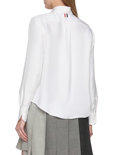 Cut from luminous silk twill, this shirt brings Thom Browne’s signature precision to a softer register. The oversized bow tie and detachable collar create a sculptural focal point, while the fluid drape introduces ease to its refined tailoring. Ideal for elevating modern suiting or lending romance to everyday separates.