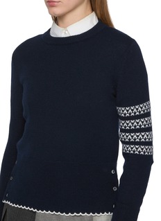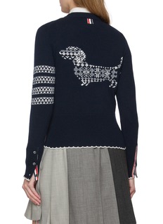 A playful yet meticulously crafted winter staple, this sweater celebrates Thom Browne’s iconic Hector motif through intricate jacquard work. The contrast scalloped edges and signature side buttons lend a refined, handcrafted charm. Perfect for festive gatherings or adding personality to everyday layering.