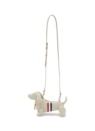 Embrace your playful side with the Thom Browne grained leather dachshund bag. This exquisitely crafted accessory features charming gold-tone accents, offering a unique blend of whimsy and sophistication for the stylish individual.