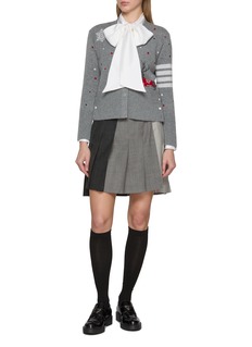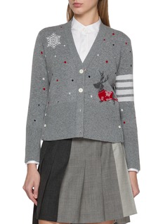A joyful celebration of Thom Browne’s winter iconography, this cardigan blends reindeer, snowflakes, and the signature Hector motif into a spirited intarsia jacquard tableau. Spun from an exceptionally soft cashmere blend, it offers warmth with a touch of nostalgia—perfect for festive layering or adding character to everyday tailoring.