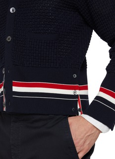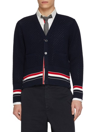 Expressing Thom Browne’s meticulous knitwear language, this cardigan is crafted from high-twist cotton in a tactile ripple stitch. The graphic RWB stripe at the hem grounds the silhouette with unmistakable house codes, making it a composed layer for sharpened everyday tailoring or refined off-duty styling.