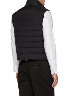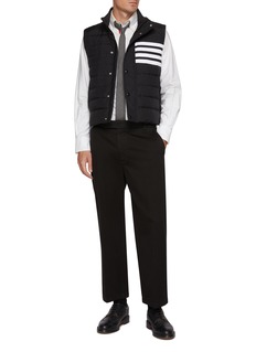 Thom Browne reimagines outerwear through a polished, athletic lens with this lightweight down vest, cut from subtly lustrous ripstop for resilience and ease. The iconic 4-bar motif sharpens the quilted construction, creating a piece that layers effortlessly—from tailored shirting to off-duty knits.