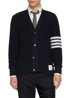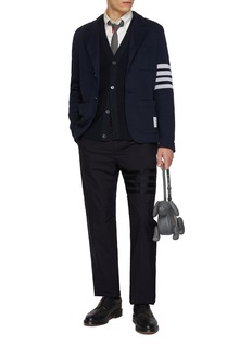Refined through Thom Browne’s lens of modern uniform dressing, this cardigan is crafted in textured cotton piqué for structure and breathability. The iconic 4-bar stripe sharpens its collegiate character, ideal for layering over shirts or tailoring with understated confidence.