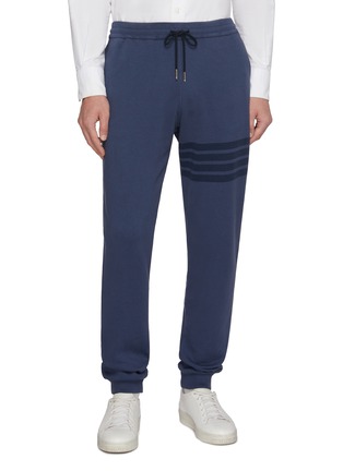 Grounded in Thom Browne’s modern uniform language, these sweatpants are crafted from soft cotton jersey with a streamlined, tapered silhouette. The tonal 4-bar detail is subtly integrated along the leg, offering a refined expression of sportswear codes suited to composed off-duty dressing or elevated travel looks.