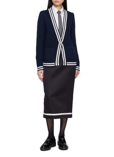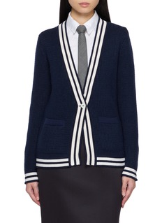 A refined expression of collegiate heritage, this V-neck cardigan showcases Thom Browne’s mastery in proportion and polish. Spun from a luxurious silk, wool, and cashmere blend, it feels sumptuously soft against the skin. The contrast striped trims frame the silhouette with signature precision — the ultimate layering piece for timeless preppy style.