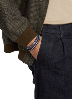 Discover the craftsmanship of the Thompson Artisanal Bracelet, featuring elegantly arranged blue cord segments interspersed with shimmering silver-toned accents. This bracelet combines durability with a touch of sophistication, making it an ideal accessory for both casual and formal occasions. The adjustable design ensures a comfortable fit for any wrist size.