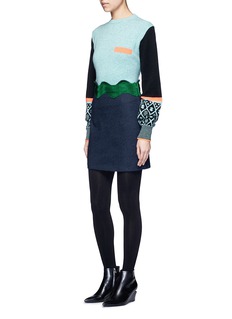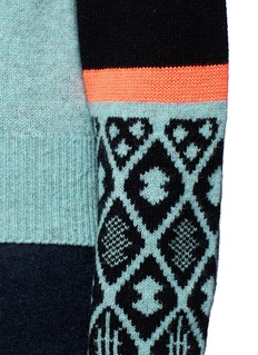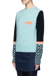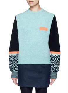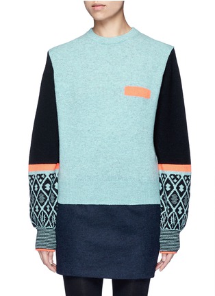 这款羊毛针织衫来自于日本品牌TOGA ARCHIVES的副线TOGA PULLA,贯彻其独特前卫的创作风格。以绿拼黑色为主调,袖口加入富有民族风格的几何造型图案点缀,左胸通过一根荧光橙色条纹,塑造出仿口袋的效果,展示出品牌丰富幽默的创造力。