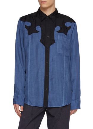 Fluid cupra is cut with a sharp Western sensibility, where sculpted contrast panels trace the shoulders and yoke with graphic intent. Lightweight and softly lustrous, it elevates tailored trousers or denim alike—an expressive piece for refined evenings or directional daytime styling.