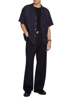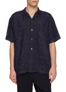 Sheer embroidery forms a graphic floral grid across a lightweight mesh base, creating depth through transparency and texture. Framed by a fluid cupra lining, this short-sleeve shirt reflects Toga Virilis’ experimental approach—ideal for layered summer looks with tailored ease.