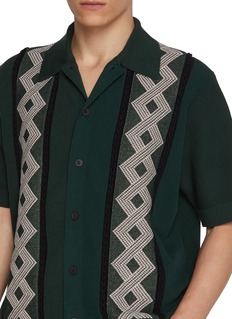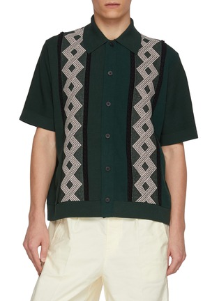 Step into the spotlight with TOGA VIRILIS’s dark green short-sleeve shirt, a striking piece that combines traditional craftsmanship with a modern aesthetic. This shirt is designed with unique geometric embroidery in contrasting white and black, creating a bold visual impact. The structured collar and clean button-down front maintain a classic look, while the intricate embroidery adds a distinctive touch, setting this shirt apart from standard casual wear. Made from a premium fabric that ensures both comfort and durability, it's perfect for those who want to make a statement.
