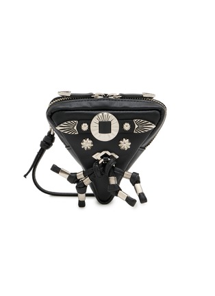 Discover the TOGA VIRILIS Triangle Shoulder Pouch, a masterpiece of design that combines avant-garde aesthetics with practicality. This striking accessory is crafted from premium black leather and is detailed with unique silver-tone embellishments including stars, stripes, and a central geometric motif. Its distinctive triangular shape is not only eye-catching but also ideal for carrying your essentials in style. Equipped with an adjustable leather strap, this pouch is perfect for those who covet a statement piece that is as functional as it is fashionable.