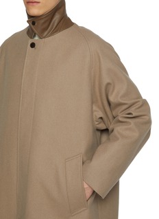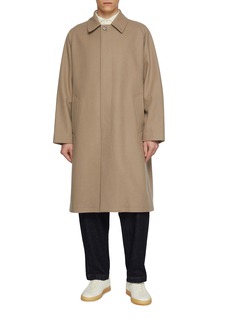 Tailored in a smooth smart-merino blend, this single-breasted coat offers Tomorrowland’s signature balance of structure and softness. The shirt collar and concealed placket create a clean, elongated line, while its relaxed drape brings quiet sophistication to layered winter looks—from denim to refined knits.