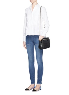 托里伯奇这款FLEMING单肩包以黑金拼色为基础,精致的缝线结合柔软厚实的皮革,打造出极富质感的菱格压纹表面,配合金色链条肩带,散发华丽贵气的摩登都市魅力。