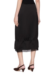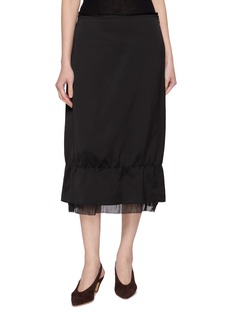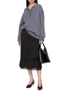 TOTEME 以材质碰撞重塑半裙形态,这件单品选用垂坠缎面面料,下摆荷叶边与内层薄纱形成层次对比,利落腰头弱化裙装的柔化感,搭配绒面穆勒鞋,精准诠释北欧极简美学中的柔与刚。