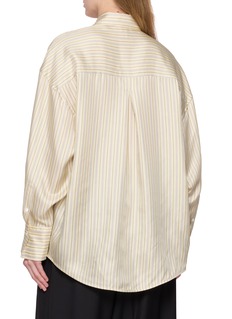 TOTEME 秉持北欧简约美学,风格克制而精致。此衬衫采用条纹基底,宽松剪裁释放舒适,垂坠面料衬显格调,尽显北欧极简质感。