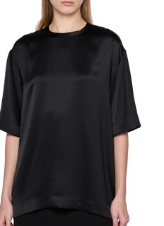 TOTEME 以斯堪的纳维亚美学为核,塑造简约北欧风格。这款上衣以缎面肌理衬显质感,宽松版型舒展自在,短袖剪裁利落透气,搭配阔腿牛仔,尽显北欧清冷松弛感。