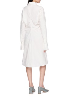 棉质的柔软肌理与腰部褶皱形成对比,TOTEME 的衬衫式设计打破常规,长款袖管成为视觉锚点,纽扣门襟保留了衬衫的实用属性,让这件单品在极简表达与日常实穿间找到平衡。