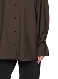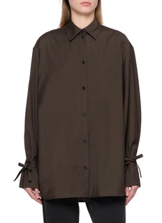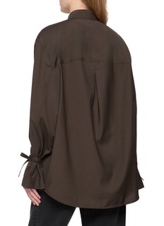 TOTEME 以斯堪的纳维亚美学为核,塑造简约北欧风格。这款衬衫以绑带袖设计柔化线条,宽松版型舒展自在,垂坠肌理衬显质感,搭配黑色牛仔裤、皮包与尖头高跟鞋,尽显北欧清冷松弛感。