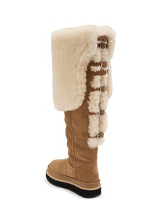 In a soft chestnut shade, this sacai x UGG thigh-high boot captures the essence of cozy modernism. Defined by its oversized shearling cuff and multi-buckle detailing, the design’s supple suede texture and grounded platform silhouette evoke an effortless blend of warmth, structure, and statement-making comfort.
