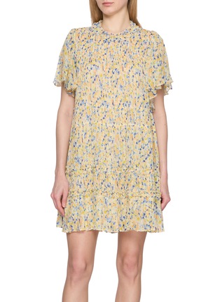 Softly pleated and scattered with painterly florals, this airy silhouette captures Ulla Johnson’s romantic sensibility with effortless grace. The Ryla mini dress drapes lightly through flutter sleeves and tiered ruffles, creating fluid movement—perfect for sunlit brunches, garden gatherings, or warm-weather escapes.