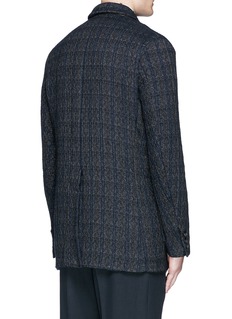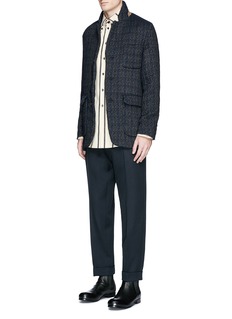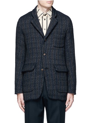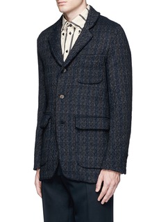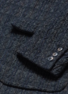 Uma Wang这款西服外套采用混羊毛面料打造,具有一定保暖作用。在深浅蓝色混棕色格纹基础上,压以条纹及菱格纹点缀,带来凹凸触感的同时透出精致复古气息。