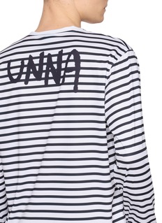UNNA's striped running T-shirt features dropped shoulder sleeves with thumbholes. It has a water-based sublimation-printed stripe pattern and is made from quick-drying, post-consumer recycled polyester with 4-way stretch for flexibility, and perforations for ventilation and breathability. A bold, hand-drawn UNNA text on the back infuses the piece with a rebellious touch.