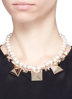 Valentino Garavani这款项链充分体现了品牌的优雅气质,以亮泽的象牙白色人造珍珠为基础,珍珠之间加入大小金字塔铆钉装饰,注入一份朋克感,为造型增添高贵奢华魅力。