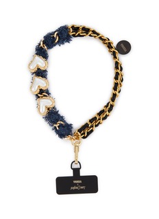 Elevate your everyday style with the VENNA phone strap. This unique accessory blends functionality with high fashion, featuring a striking mix of gold-tone chains and navy denim, punctuated by elegant pearl-like accents. Perfect for those who cherish a blend of luxury and practicality in their accessories.