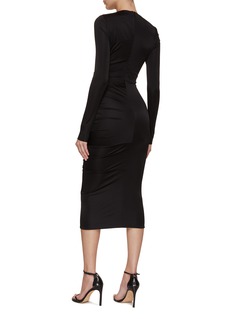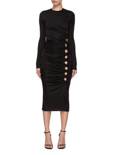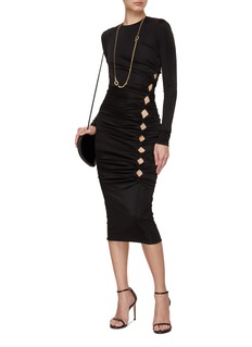 Versace(范思哲)由 Gianni Versace 创办,主打大胆的印花与鲜明的廓形,呈现鲜活意式风格。这件连衣裙用褶裥和菱形镂空设计打造鸡尾酒聚会的聚光点。