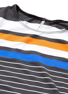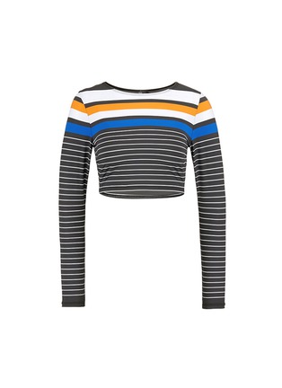Vitamin A从旅游、现代艺术等不同领域汲取灵感,这款防晒衣借鉴了冲浪服,短款设计可以展示美好身型,橙色及蓝色粗条纹点亮了灰白色细条纹图案,让您轻松成为沙滩上的焦点。