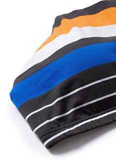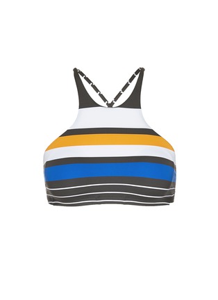 Vitamin A的泳装兼具活力与时尚风格。这款比基尼泳衣用白、橙、蓝、灰拼色打造出粗细不一的横条纹图案,配以背部交叉带和系带设计,展现摩登性感气息。高科技面料舒适耐用,让您展示身材时尽情享受运动乐趣。