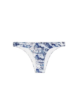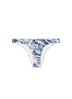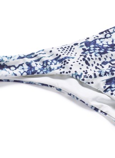 ViX这款比基尼泳裤采用低腰及半包臀设计,有助修饰腰部线条,同时突显优美的下半身线条,白色底、蓝色抽象蛇纹图案的组合透出一份清新而迷幻的感觉,背面附有小小的镀24k金品牌标志,流露一份低调奢华。