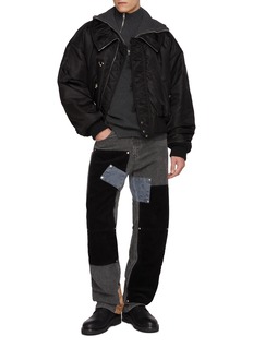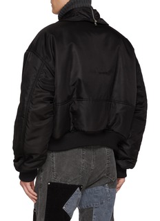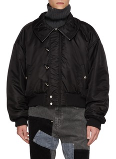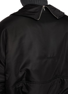 Infused with WE11DONE’s signature oversized ease, this bomber jacket is cut from lustrous nylon with a sculptural high collar. Hook closures and ribbed trims refine the voluminous silhouette, making it a modern statement piece that balances function with avant-garde cool.