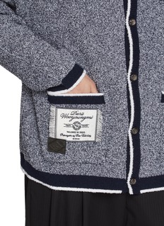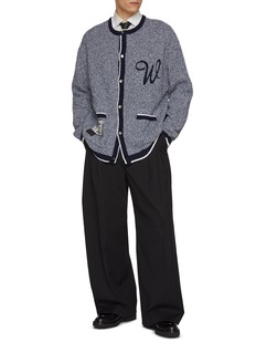 WOOYOUNGMI 这款开衫将经典学院风与现代精致感巧妙融合,采用纹理灰调底色搭配对比鲜明的蓝色镶边。超大"W"字母刺绣与金属纽扣细节增添俏皮优雅气息,成为精致日常造型的百搭宣言单品。