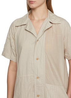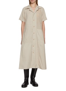 Patchwork becomes quiet geometry in this A-line dress, where Y’s pieces together matte cotton and subtle cupro-blend panels in shifting tones and textures. The relaxed, collared silhouette drapes with understated ease, making it a versatile staple that pairs effortlessly with boots or sandals across seasons.