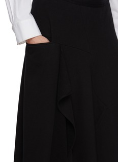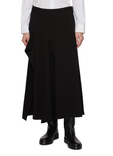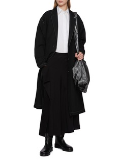 Y's 擅长用不对称的剪裁,去线条化的轮廓,细腻独特的质地,以及设计中对身体和服装之间空白间隙的考量。这款针织裙从裤装解构汲取灵感,打造三角拼接结构,呈现出裙裤混合的视觉张力。