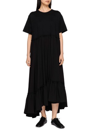 Designed with a T-shirt-inspired upper, this dress from Y’s contrasts a clean jersey bodice with a softly gathered skirt for fluid movement. The asymmetrical tiered construction introduces subtle volume and dimension, creating a relaxed silhouette that drapes effortlessly through the length.
