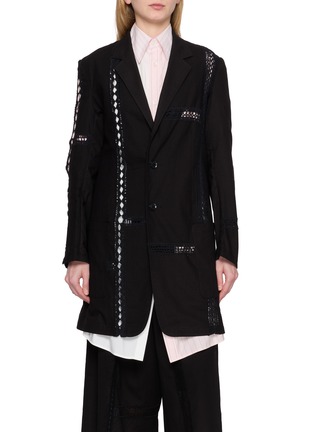 Tailoring takes on a textural dimension in this jacket from Y’s. Structured with classic lapels and a clean single-breasted front, the design is punctuated by openwork lace panels that run across the body and sleeves, revealing subtle layers beneath while maintaining a refined silhouette.
