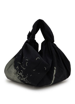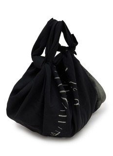 Infuse artistic elegance into your accessory collection with the Y’s Mini Furoshiki Bag. This piece showcases a captivating black fabric adorned with delicate silver embroidery depicting whimsical motifs, reminiscent of traditional Japanese aesthetics. The bag's innovative knot-tied handles and unstructured form not only reflect a unique design but also offer a versatile and spacious interior, perfect for carrying essentials with style.