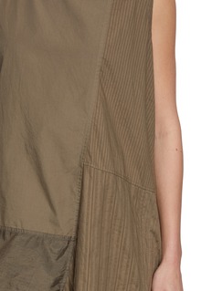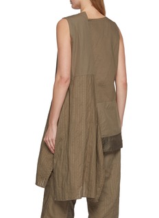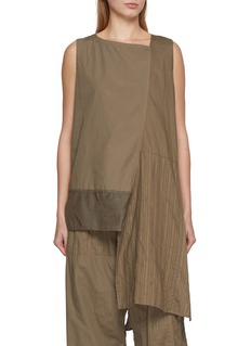 An exploration of form and surface, this patchwork top layers matte cotton with subtly lustrous cupro-blend panels to create movement and tonal depth. Y’s shapes the silhouette with an asymmetric drape that cascades along the body, inviting effortless pairing with wide-leg trousers for a sculptural, minimalist statement.