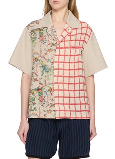 A study in contrast, this patchworked shirt by young n sang juxtaposes floral tapestry motifs with bold chequered panels for an artful, collage-like effect. The asymmetric overlay and subtle hand-beaded accents introduce dimension, redefining classic shirting with a contemporary twist. Style it loose over striped shorts for playful harmony.
