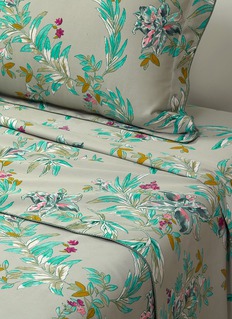 Yves Delorme 这款四件套精选柔软丝滑的棉缎制成,以深邃、明亮的丰富色调揭示了树叶和含苞待放的花朵的主题,装饰着宫殿内庭院的隐居处。