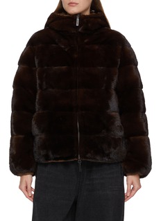 Indulge in the unparalleled warmth and style of Yves Salomon's plush mink fur jacket, featured in a rich espresso hue. This jacket offers a modern aesthetic with its horizontal stripe detailing and a high collar, perfect for shielding against brisk winds. The smooth zipper closure ensures a seamless look while providing practical ease of wear. Ideal for urban adventures or elegant evenings out, this jacket is a testament to classic luxury with a contemporary twist.