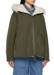 Versatility meets luxury in this Yves Salomon parka. The reversible design offers two distinct looks, one side features a sleek, minimalist aesthetic, while the other boasts a plush fur collar for added warmth and texture. Its oversized fit and functional details make it a practical yet stylish choice for any season.