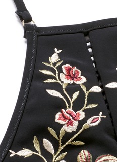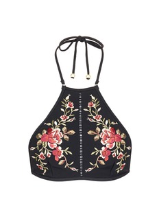 Zimmermann由Nicky及Simone两姊妹于1991年在悉尼创立,品牌特别注重细节、色彩及印花的运用,致力打造辨识度高的女性化时装及沙滩装。这款SAKURA比基尼泳衣来自Summer Swim 16系列,精选舒适亲肤的意大利弹力面料裁制,缀以花卉刺绣及镂空方格,加强廓形立体感同时点亮黑色设计,搭配绕颈款式,令您的沙滩造型高贵又典雅。