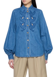 Zimmermann lends a poetic edge to classic denim with this cotton shirt, adorned with tonal bird appliqué and precise topstitching. The stand collar and gleaming gold buttons introduce a refined contrast—style it tucked into tailored shorts or flowing skirts for a modern take on romantic dressing.