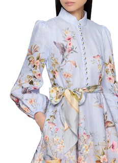 Zimmermann 凭借出众的版型和精致细节令每件单品都散发出独特的女性韵味。这款连衣裙印上栩栩如生的花卉图案,立领搭配精致纽扣,增添优雅气质;夸张的泡泡袖设计,复古又俏皮 。腰间的蝴蝶结系带不仅能勾勒出纤细腰身,还为整体造型增添了几分灵动。