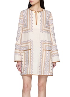 A study in understated romance, this Tunic mini dress from Zimmermann’s Spring 2026 “Kindred Spirit” collection is cut from airy linen with a softly structured silhouette. The deep V-neckline, accented by a gold chain and rouleau tie, lends artisanal charm—ideal for sunlit escapes or city wanderings.
